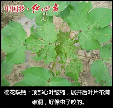 植株矮,叶片老化,果枝少,结铃少,生长点严重被抑制,呈弯钩状,叶片提前脱落。严重缺钙时,新叶叶柄下垂,并溃烂。