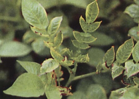 幼叶边缘出现淡绿色条纹,叶片皱缩。严重时顶芽死亡,侧芽向外生长,呈簇生状。易生畸形成串小块茎。