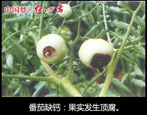 上部叶片变黄,下部叶片保持绿色,生长受阻,顶芽常死亡。幼叶小,易成褐色而死亡。近顶部茎常出现枯斑。根粗短分枝多,花少脱落多,顶花特别容易脱落。果实出现脐腐病,果实膨大初期,脐部果肉出现水浸状坏死,以后病部组织崩溃、黑化、干缩、下陷。